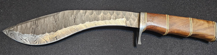 Damascus Steel: Modern pattern welded Damascus steel; 512 hard higher carbon steel are welded to many layers of soft lower carbon steel layers. The pattern is designed, and the blade is forged-welded, twisted, drilled, flattened, grounded, and forge-welded. The stack of steel is formed into a billet, and these billets or bars are then used to make a knife. The knife is profiled, ground, heat treated, and finished with additional processes like etching and bluing to reveal the striking pattern. The blade is tempered & edge is fully sharpened.